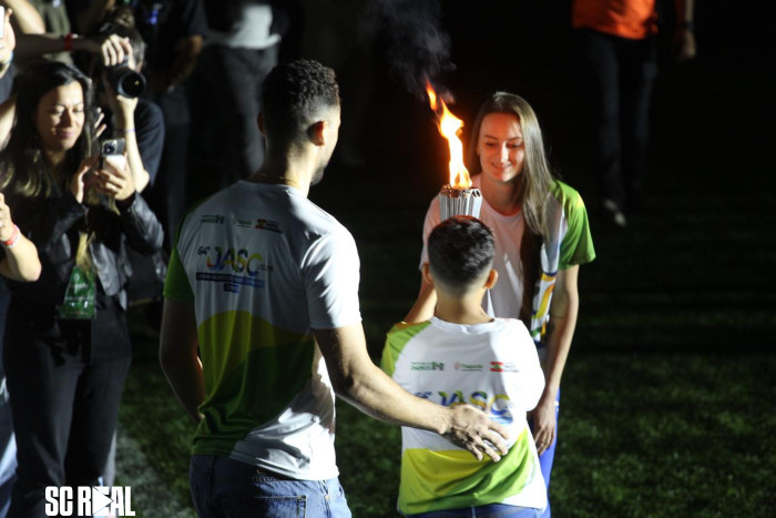 Divulgacao A superação foi tema da abertura oficial dos Jogos Abertos de Santa Catarina (JASC), realizada nesta quarta-feira, na Arena Condá. Teve espetáculo de som, luzes e coreografias, entrada das delegações, acendimento da pira olímpica, show nacional com Biquini Cavadão e muita emoção.
